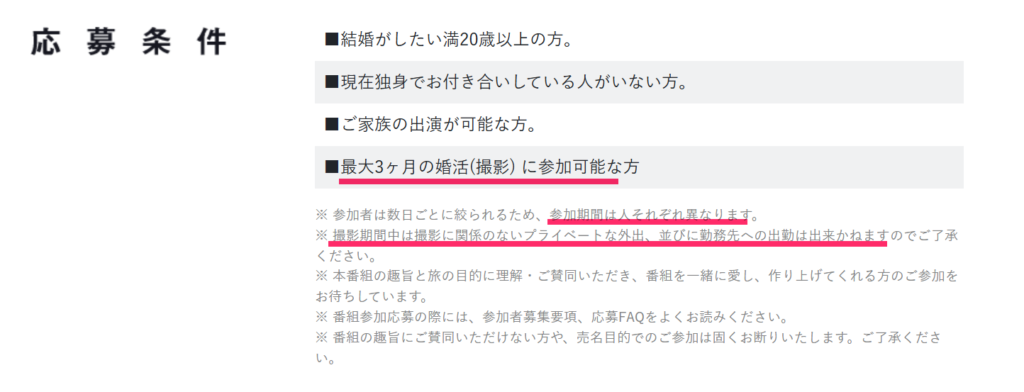 募集要項では、参加者は最大3か月の婚活(撮影)に参加可能であること、さらに参加者は数日ごとに絞られるため参加期間は人それぞれ異なると案内されています。