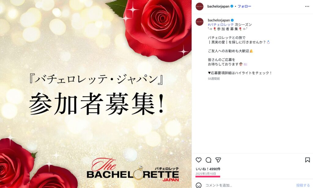公式には撮影期間が明かされていないものの、募集要項の最大3か月、参加者プロフィールの年齢表記、そしてInstagramの空白期間をあわせて見ると、長く残った参加者で2か月台後半〜3か月弱ほどだった可能性が見えてきます。