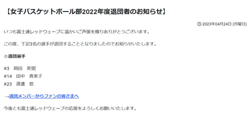 2023年4月24日 富士通レッドウェーブ退団 現役引退を公式発表 |
