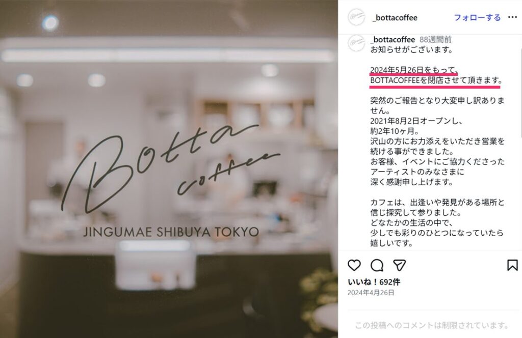 2024年5月26日にBOTTACOFFEEが閉店していた