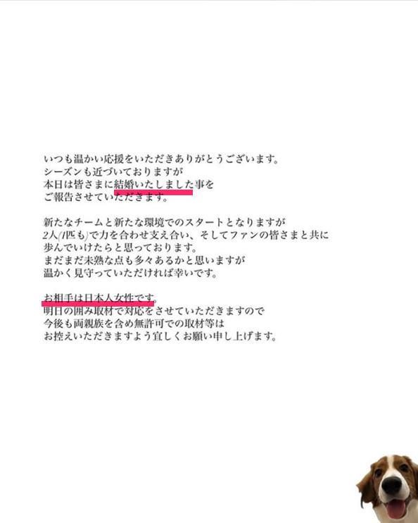 大谷翔平選手はその後、2024年2月29日にInstagramで結婚を発表し、翌2024年3月1日(日本時間)に取材対応も行っています。