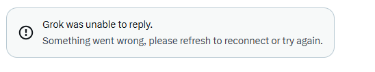 | Grok was unable to reply. Something went wrong, please refresh to reconnect or try again. | 再読み込みや時間を置くと戻ることがある |