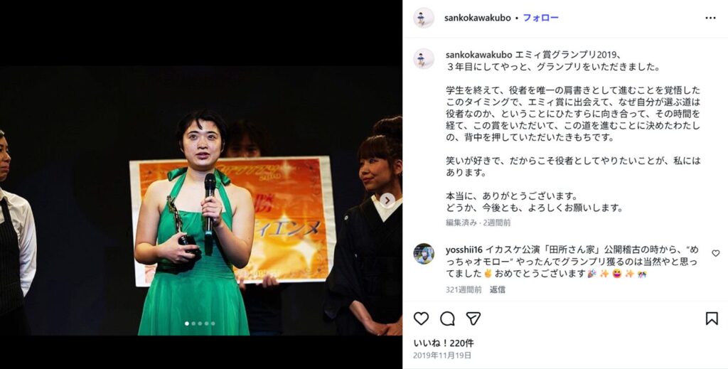 2019年の受賞をきっかけに舞台女優として注目され、その後はテレビドラマや映画にも出演の幅を広げています。
