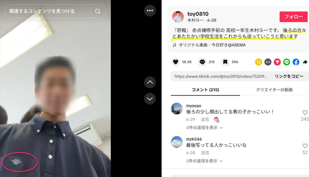もうひとつは、とういくんの動画に映っていたネクタイや制服デザインが高島高校のものと非常に近いという指摘です。