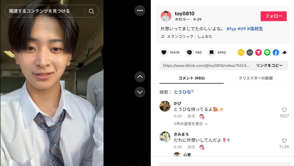 過去に学ランに見える動画があった件については、コメント欄に第三者から「ちがう」という返信がついており、とういくん本人がそのやり取りの両方に「いいね」をしていることから、学ラン姿は日常の制服ではないというニュアンスも感じられます。