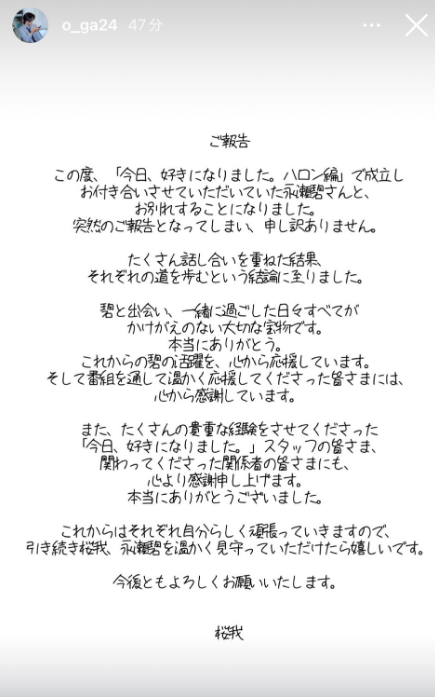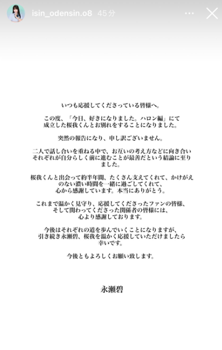 2025年12月21日、桜我さん・永瀬碧さんはそれぞれのInstagramストーリーで破局を報告しました。
