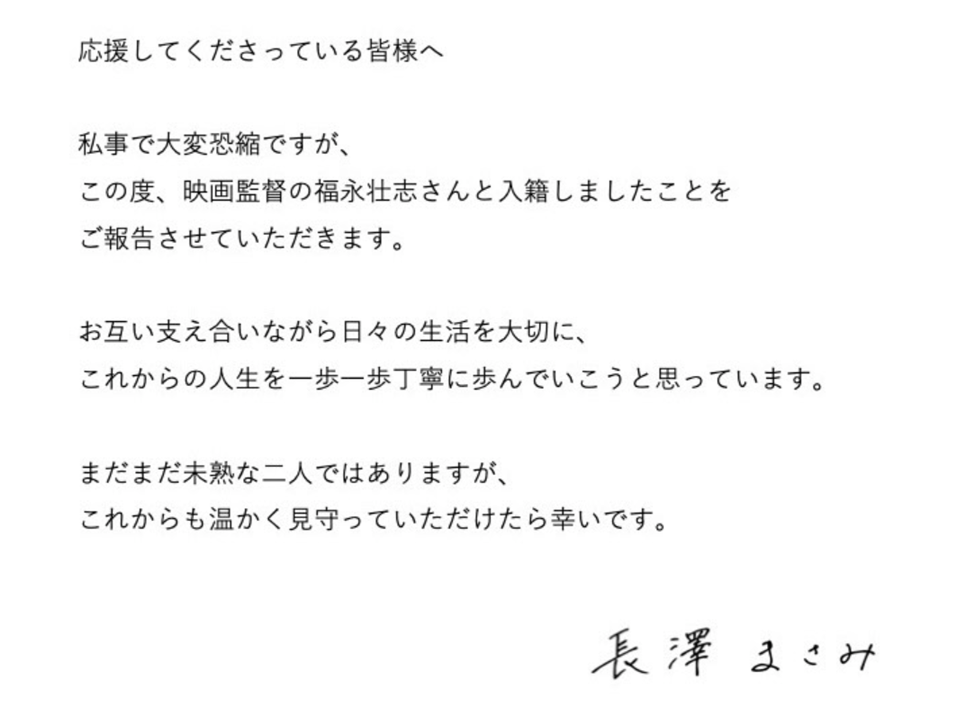 長澤まさみさんは、2026年1月1日に結婚したことを正式に発表しました。