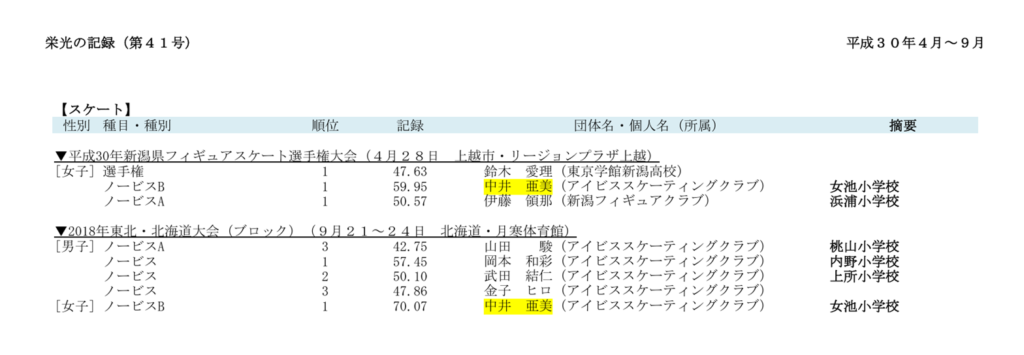 大会の記録や事業報告書のなかに「中井亜美(女池小学校)」という表記があり、小学生時代の所属クラブは新潟市内のアイビススケートクラブ(アイビスSC)とされています。