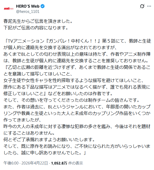 2026年4月からTVアニメの放送が始まったことで作品への注目が高まりましたが、その一方で原作描写や過去イラストへの批判、さらにHERO’S Webによる「春泥先生からの伝言」をきっかけに、SNS上で大きな議論になっています。