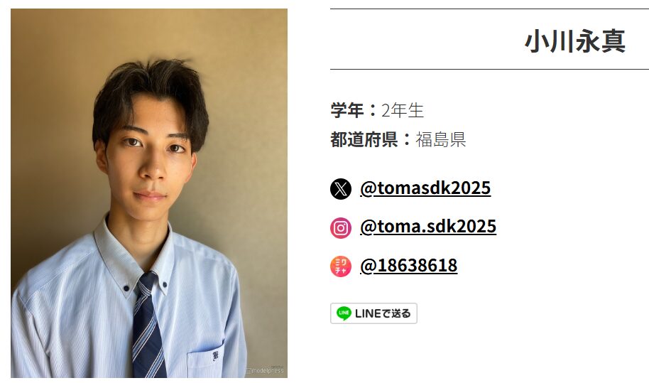 小川永真さんは、福島県出身の現役高校生で、男子高生ミスターコン2025ファイナリストとしても注目を集めたメンバーです。