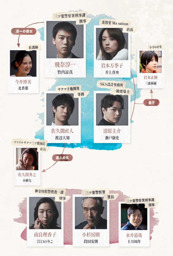 | 飛奈淳一 | 竹内涼真 | 刑事。23年前の当事者でもあり、捜査側として葛藤します |