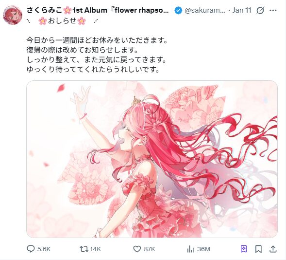 その後、2026年1月12日に「今日から1週間ほどお休みする」という趣旨の投稿があったと複数メディアが報じました。
